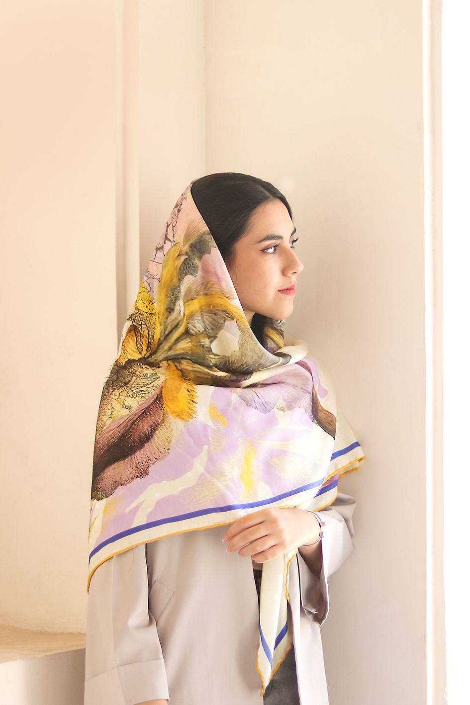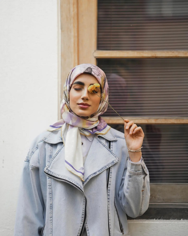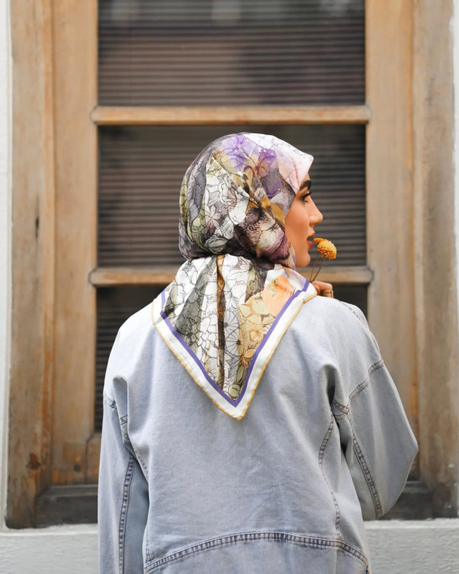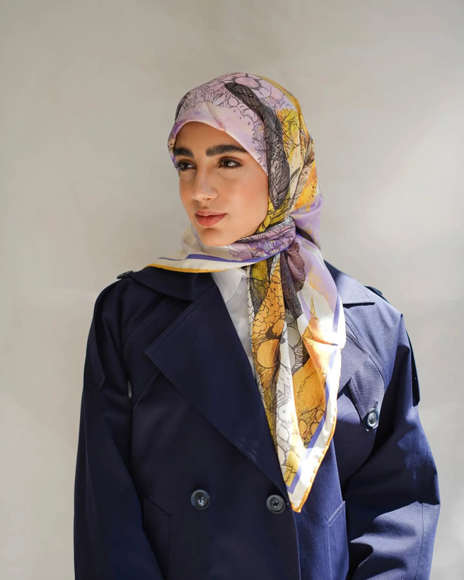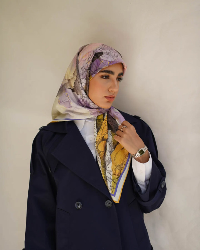 روسری های هوزاد، یک تیره و دو نشون! خودتون میتونید تصمیم بگیرید دور صورتتون شلوغ باشه یا خلوت؛ مخصوصا کنار چادر و باز مخصوصا کنار چادرهای مجلسی طرحدار حتما این مساله دغدغه تون بوده! در وصف زیباییش هم که این طرح خود بهاره!! بله، بهار! رنگهای بنفش و زرد و سبز و آبی خوش رنگش، یادآور لطافت و رنگارنگی بهاره! وقتی بارون بهاری میباره و رنگین کمون رو توی آسمون میبینی! بعدم همه جا غرق شکوفه میشه و آواز پرنده هاست که گوشت رو نوازش میده! همه اینا رو تو طرح این روسری میتونی ببینی، گل، پرنده، ابرهای بهار و رنگین کمون رنگارنگ!